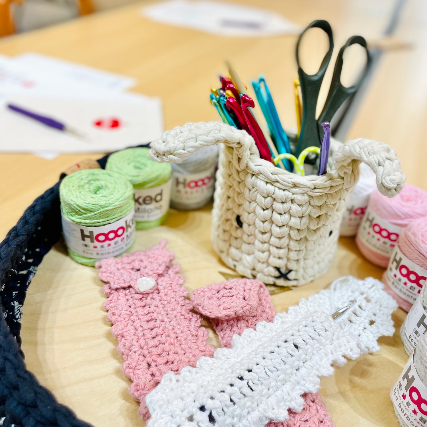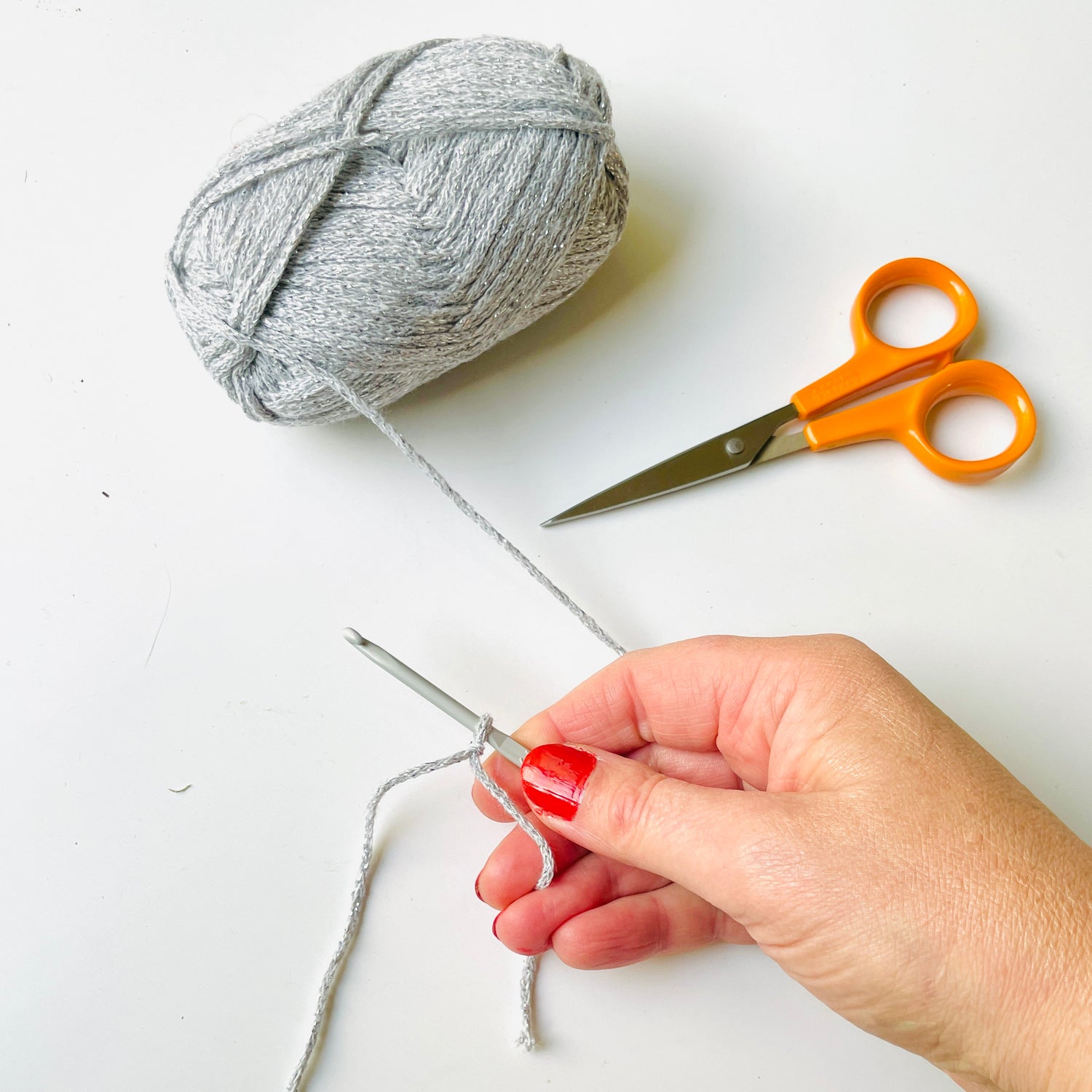 Picture shows a slipknot on the crochet hook, ready to begin!