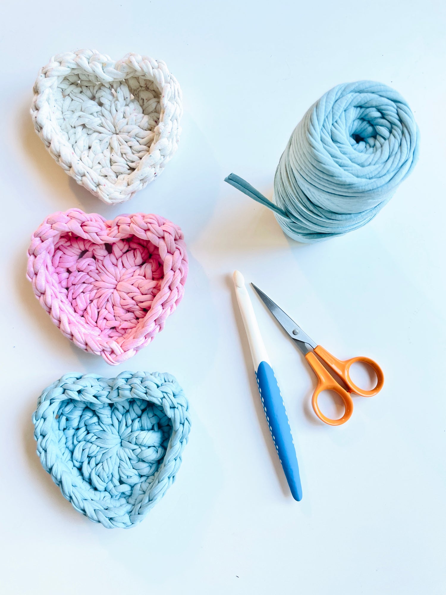 These crochet heart coasters are easy to crochet using recycled T-shirt yarn. Use them as soap dishes, trinket pots or whatever else you like!