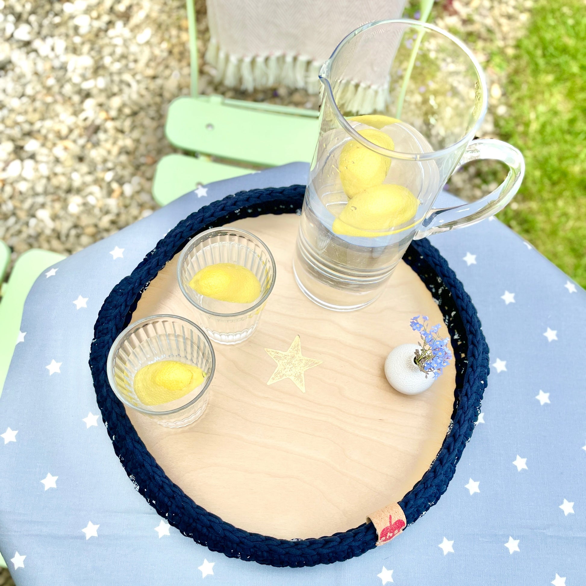 This listing is for the tray pictured - a 35 cm tray with foiled gold star, navy yarn and navy & white contrast yarn - a nautical vibe!